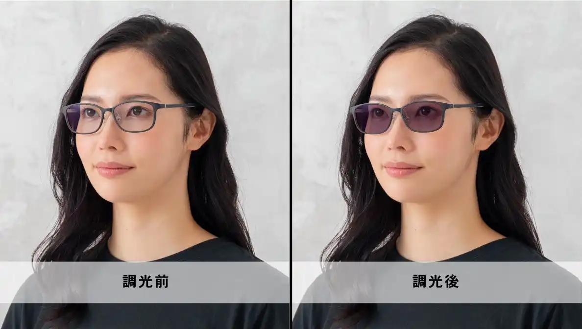 | そんなシーンにおすすめなのが、紫外線の量に応じてレンズカラーが変化する調光レンズです。屋内ではクリアなメガネとして、屋外ではサングラスとして機能し、1本で眩しさや紫外線対策ができる便利なオプションレンズです。 | ||||||||||||||