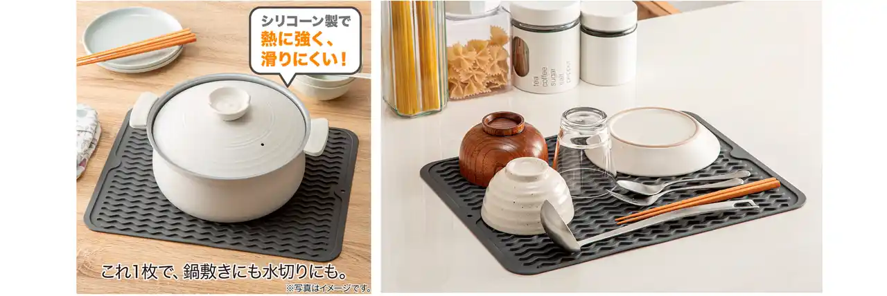 この商品は、調理中のおたま・ターナーなどの一時置きはもちろん、耐熱温度260℃まで対応しているので調理後の鍋敷きや水切りマットとしてもご使用いただけます。また、マット本体に溝があるので水切りマットとしても便利です。これひとつで、作業工程に合わせて多用途に使い方を切り替えられます。 |