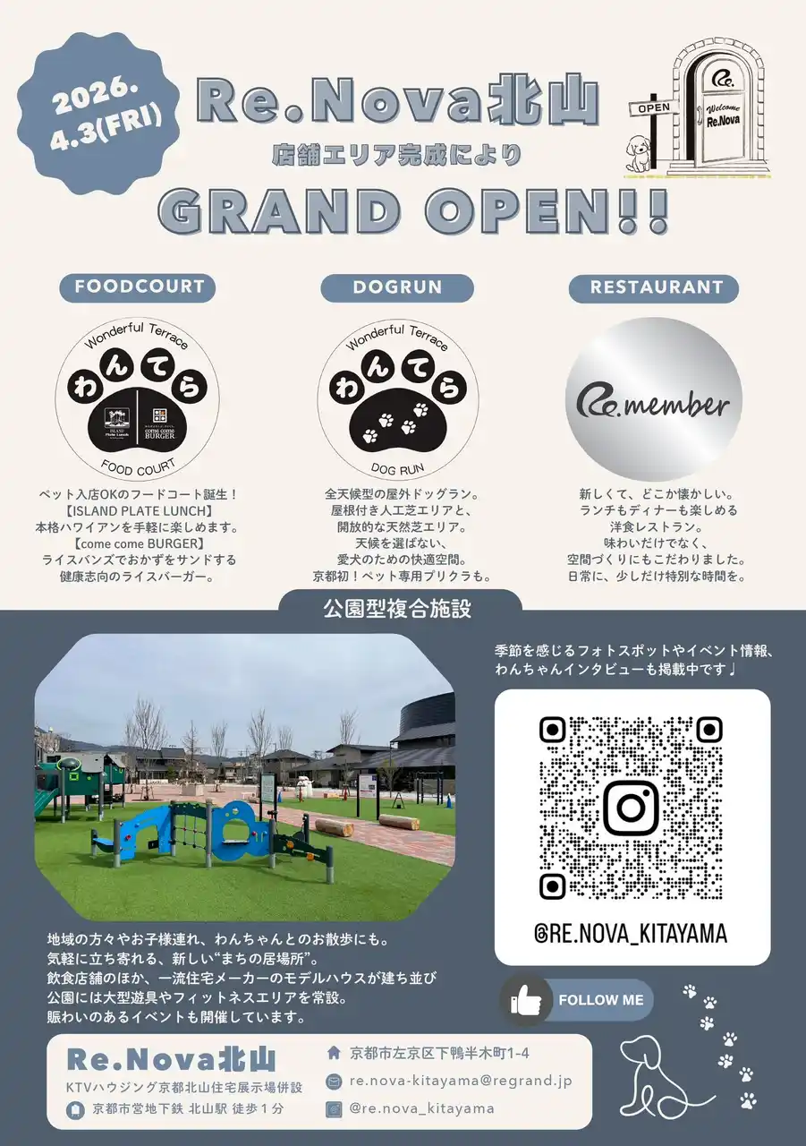 京都市左京区・北山の公園型複合施設 「Re.Nova北山」(事業主:日本リグランド株式会社 代表取締役社長 西田 亮太 京都市伏見区)に、飲食店舗やドッグランなどを2026年4月3日(金)にオープンいたします。 |