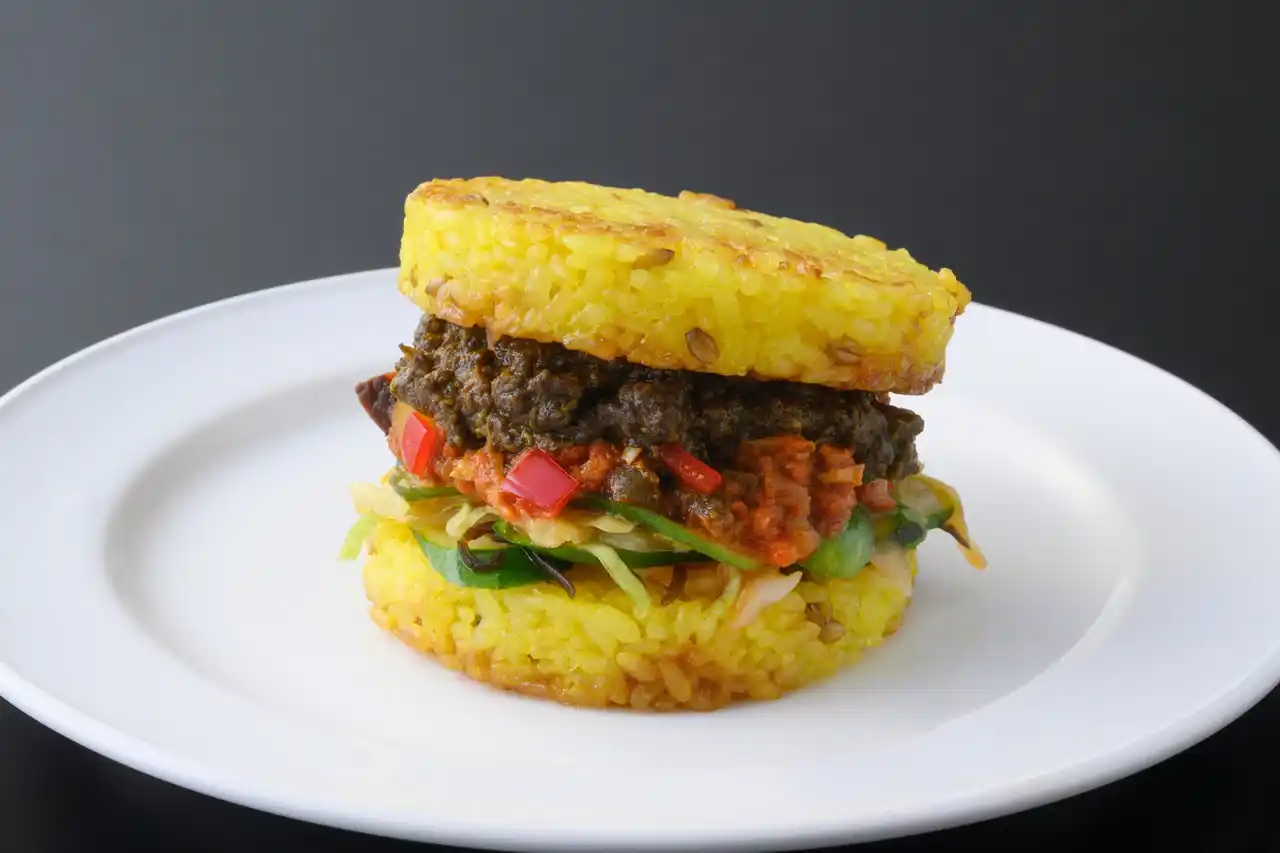 【スパイシーキーマ黒カレーライスバーガー】スパイス香る本格的なカレーフィリングをサンド。 |