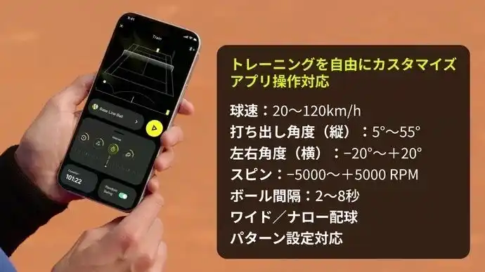 「Hi, Tenniix」と話しかけるだけ。ボイスアームバンドで、練習を止めることなく球速や回転を自由に変更できます。 |