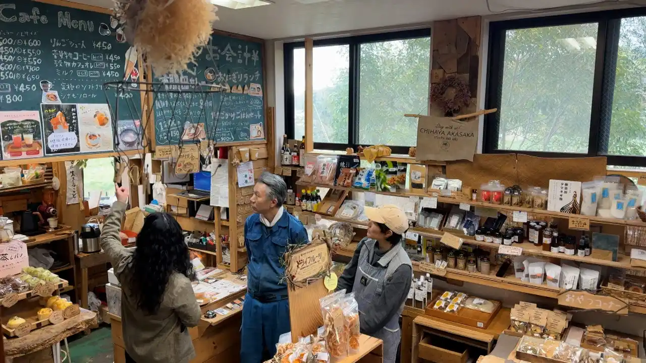 メイン施設となる一棟の建物では、村産の食材やオーガニック商品がズラリ。スタッフの小林さんが手で書いたという黒板にも味があります。 |