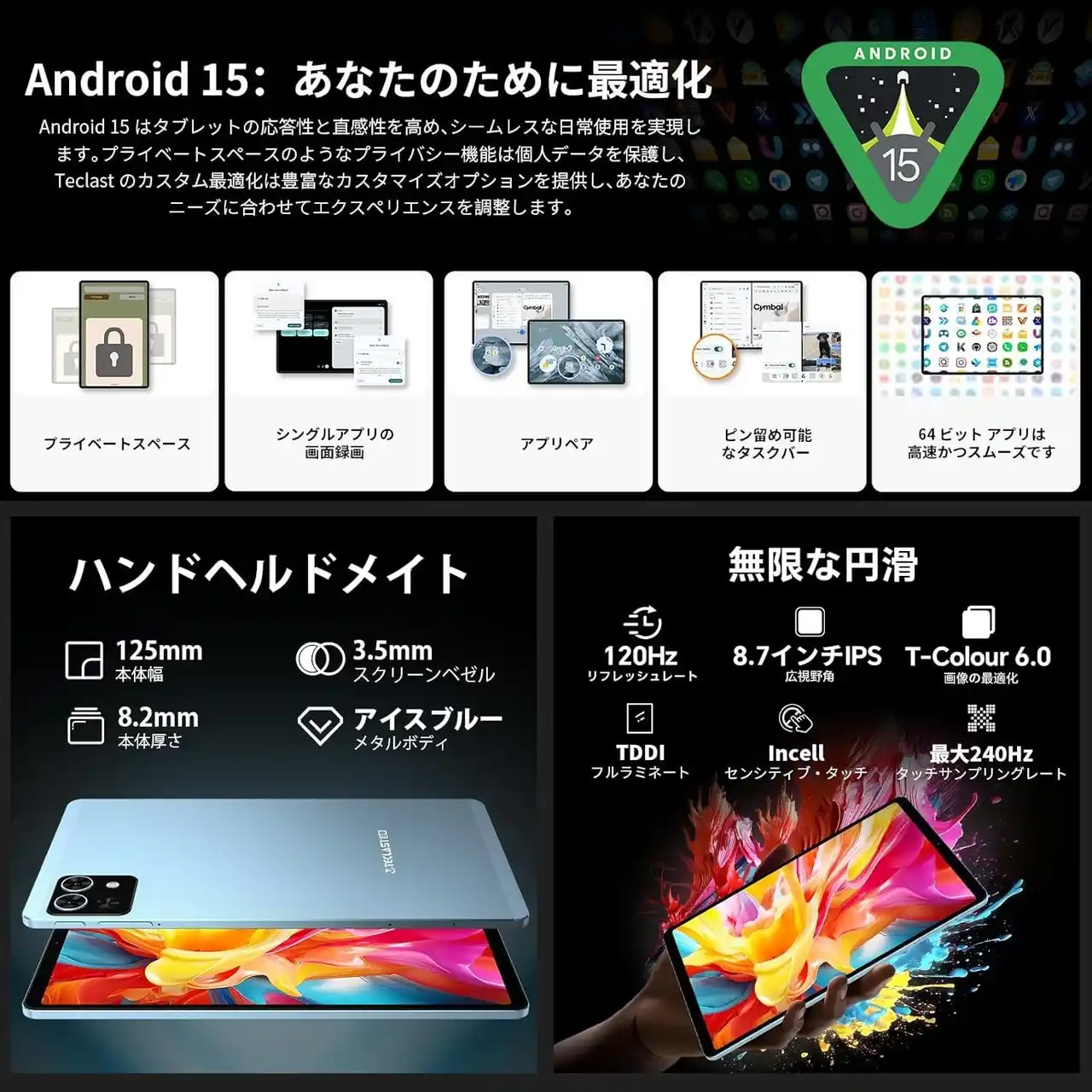 【Android 15 タブレット 8インチ】TECLAST T50 Mini 8インチタブレットはAndroid15 OSを搭載し、64ビットAPPアプリケーションに深く最適化され、起動と応答速度が向上しています。 |