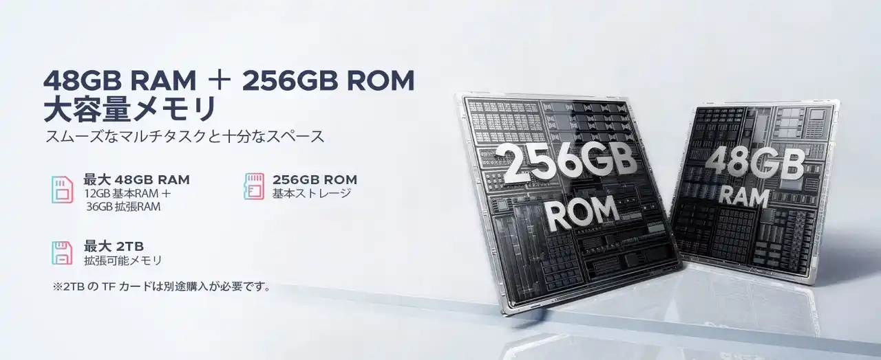 | 12GB RAMに加え、最大36GBの拡張RAM機能により、合計48GBの大容量メモリを実現。最新の6nmプロセスを採用したUnisoc T7300(AntutuでHelio G99より、性能良い) オクタコアプロセッサとの組み合わせで、複数のアプリを同時に起動するマルチタスクや、負荷の高いアプリケーションもストレスなく動作します。内蔵ストレージは256GBで、最大2TBのmicroSDカードによる拡張も可能です。 | |||