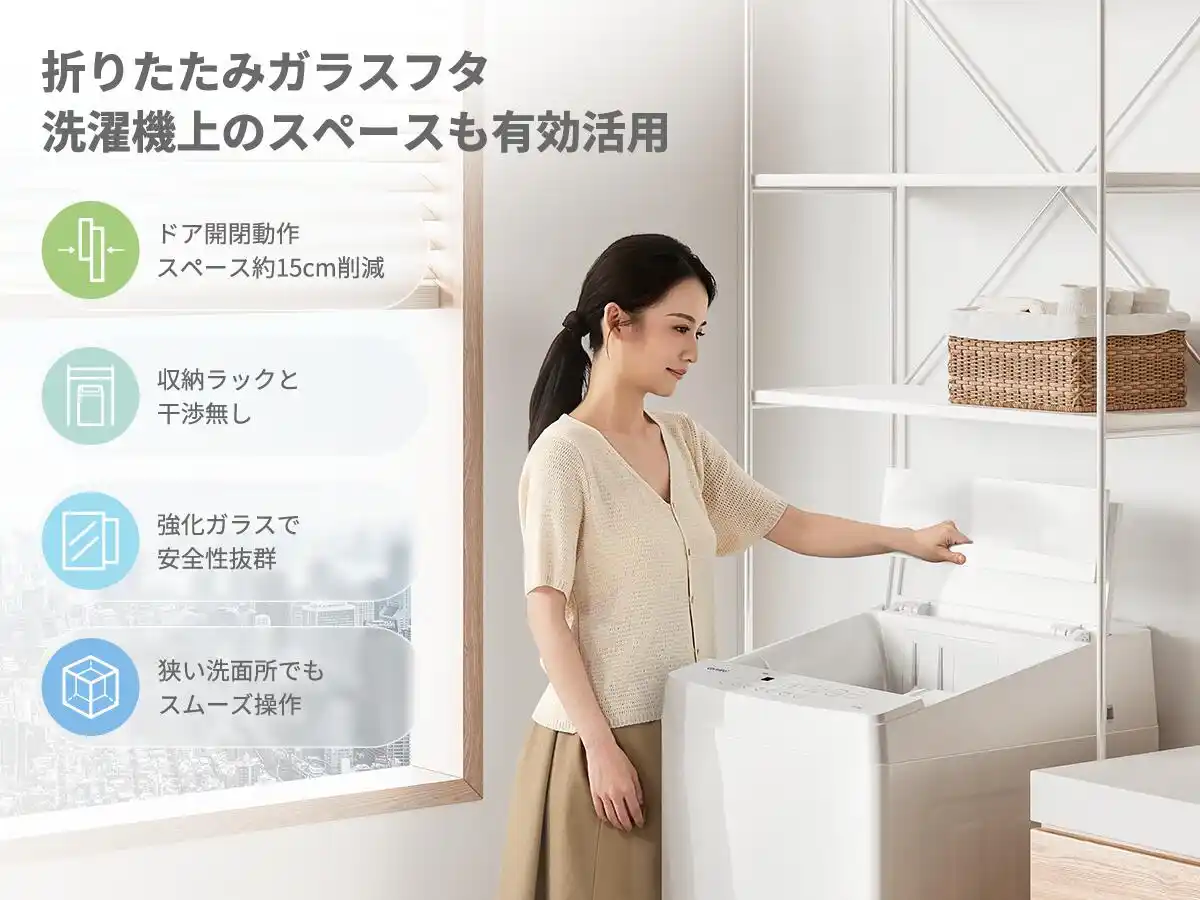 洗濯中の様子が見える透明な強化ガラスドアを採用。高級感がありながら、開閉時のスペースを最小限に抑える折りたたみ式フレームで、狭い洗濯スペースにも設置しやすくなっています。 |