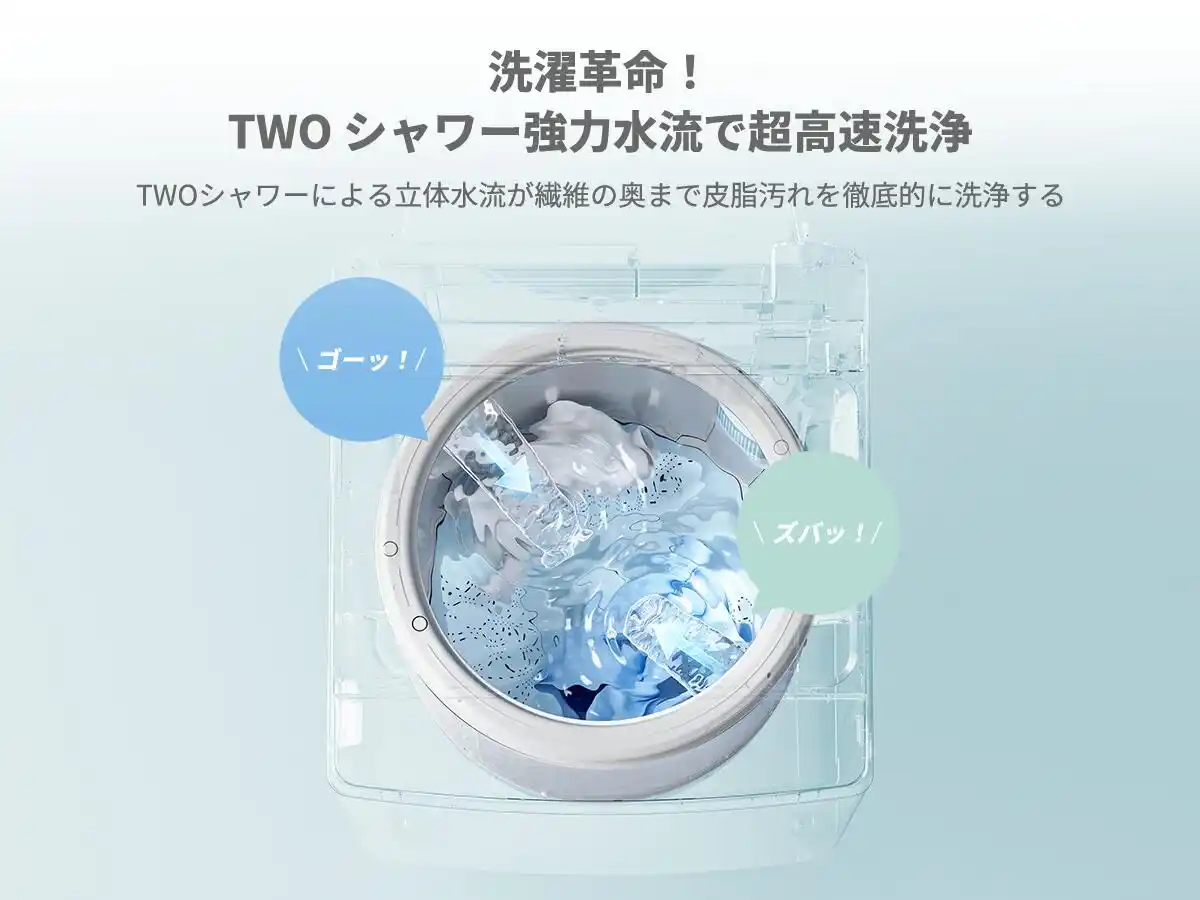 独自の技術で発生させる2方向からの強力な水流が、衣類の繊維の奥まで浸透。目に見えない汚れをしっかりと洗い流し、頑固な汚れも短時間で分解します。 |