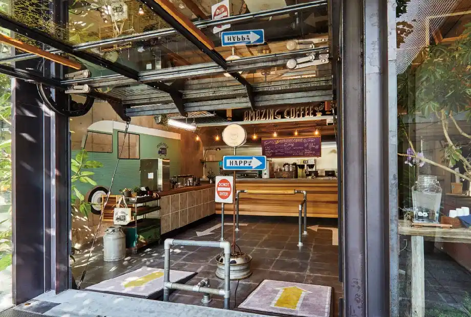 外装にはAMAZING COFFEEのフラッグを掲げ、特別棟としてひと目でわかる佇まいに。 |