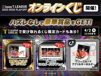 ■世界に一つだけのメッセージカードが当たる!?オンラインくじ開催! 豪華景品が当たるくじを、オンラインくじプラットフォーム「くじプラ」にて開催します。 当選後に希望選手を選べる「直筆サイン・宛名・メッセージ入りカードパネル」や、プレーオフ会場限定リアルカードの「チーム別コンプリートセット」など、超貴重なアイテムが満載! プレーオフ期間中はもちろん、終了後もお楽しみいただけるオンラインくじです。プレーオフの感動を余すところなく、最後まで楽しみましょう! ・A賞 選手を選べる!直筆サイン入りカードパネル(5名) ・B賞 直筆サイン入り!チーム別リアルカードコンプセット(12名) ・C賞 Tリーグカードアクリルキーホルダー ・D賞 プレーオフ当日生写真2枚セット ・E賞 くじ限定デジタルTリーグカード 【価格】 1回550円(税込) 【開催期間】 3/19(木)15:00 ~ 4/2(木)23:59 |