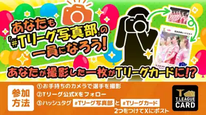 「#Tリーグ写真部」開催 プレーオフ会場では、ファンの皆様にお楽しみいただける参加型企画「#Tリーグ写真部」を実施します。あなたも「#Tリーグ写真部」の一員として、Tリーグカードに写真素材を提供してみませんか? 【企画概要】 ノジマTリーグ 2025-2026シーズン プレーオフ会場で皆様が撮影した選手の写真に、ハッシュタグ「#Tリーグ写真部」と「#Tリーグカード」をつけてX(旧Twitter)へ投稿してください。採用された作品は実際にカード化され、Tリーグカード内に登場します! 【募集期間】 3/21(土) ~ 4/4(土) ※期間内にXに投稿いただいた写真を 対象とさせていただきます。 ※期間は予告なく変更する場合があります。 【カード化までの流れ】 1.Tリーグ公式Xをフォロー。 2.指定のハッシュタグ2つを付けて写真をポスト。 3.採用候補者にはTリーグ公式X(@TLEAGUE_PR)よりDMでご連絡。 4.アンケート回答および写真の元データをご提供いただき、カード化。 ※会場での撮影は、現地の撮影ルール(https://tleague.jp/faq.php)を遵守してください。 |