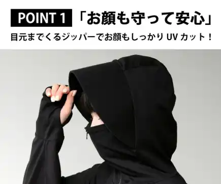 フード+フェイスカバー+指穴仕様で、顔・首・手の甲まで“隙なし”でガードします。 |