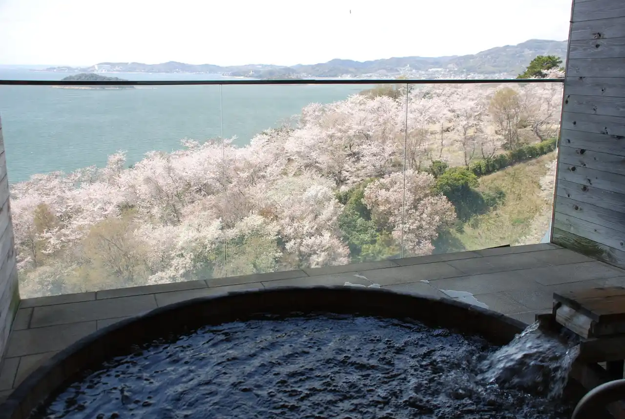 三河湾を一望する絶景大浴場は、日帰りでも利用可能。気軽に春の海と桜を楽しめます。 |