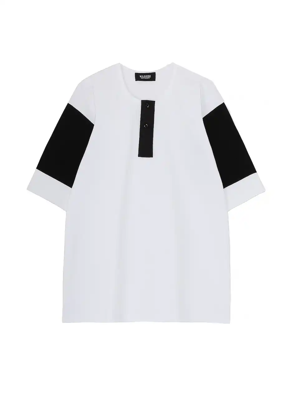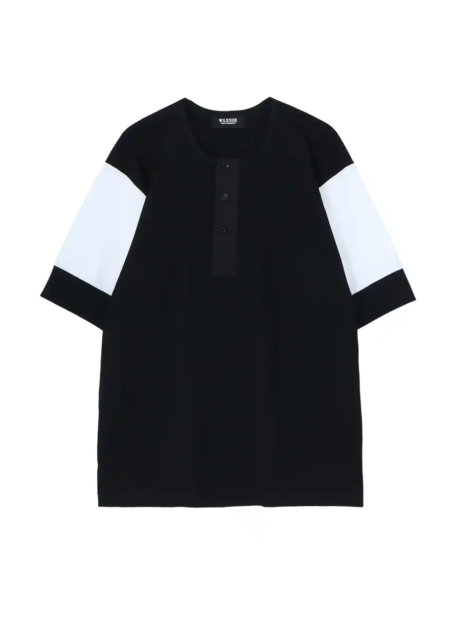 ブラックの身頃のTシャツはヘンリーネックのボタンを3つに、ホワイトの身頃のTシャツはボタンを2つにして、それぞれ異なるデザインディテールを施しています。 |