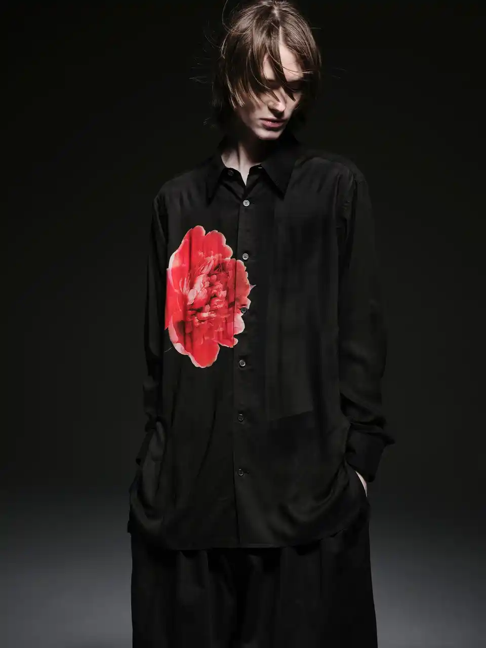 赤い牡丹、橙のダリア、青い百合の花をモチーフにしたシャツ3型が登場します。 黒のボディに色彩が鮮やかな花が際立ち、軽やかなドレープ感が特徴の薄手レーヨンを使用することで、しなやかで上品な落ち着きを実現しました。闇の中から浮かび上がるような花のプリントは、かすかなシャドー感を伴い、奥行きのある表情を演出。幅広いコーディネートに自然と溶け込む一着です。 |