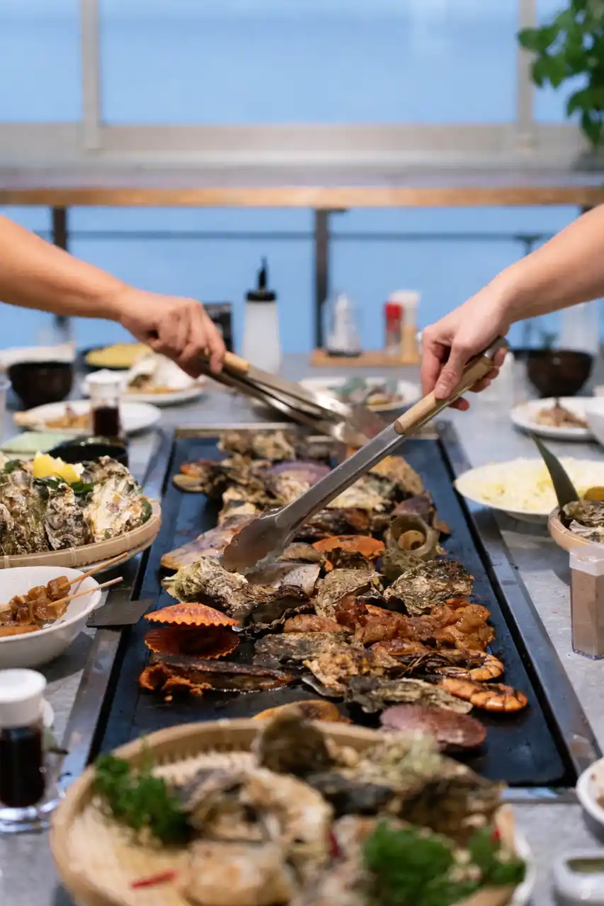 まるで小さなグルメフェスのような空間。 大人数でシェアしながら、次々に焼き上がる楽しさを体感できます。 また、牡蠣小屋 de BBQエリアは屋内型のため、天候に左右されることなく快適にご利用いただけます。 突然の雨や強風を気にすることなく、予定通りにBBQをお楽しみいただける点も大きな安心材料となっています。 |