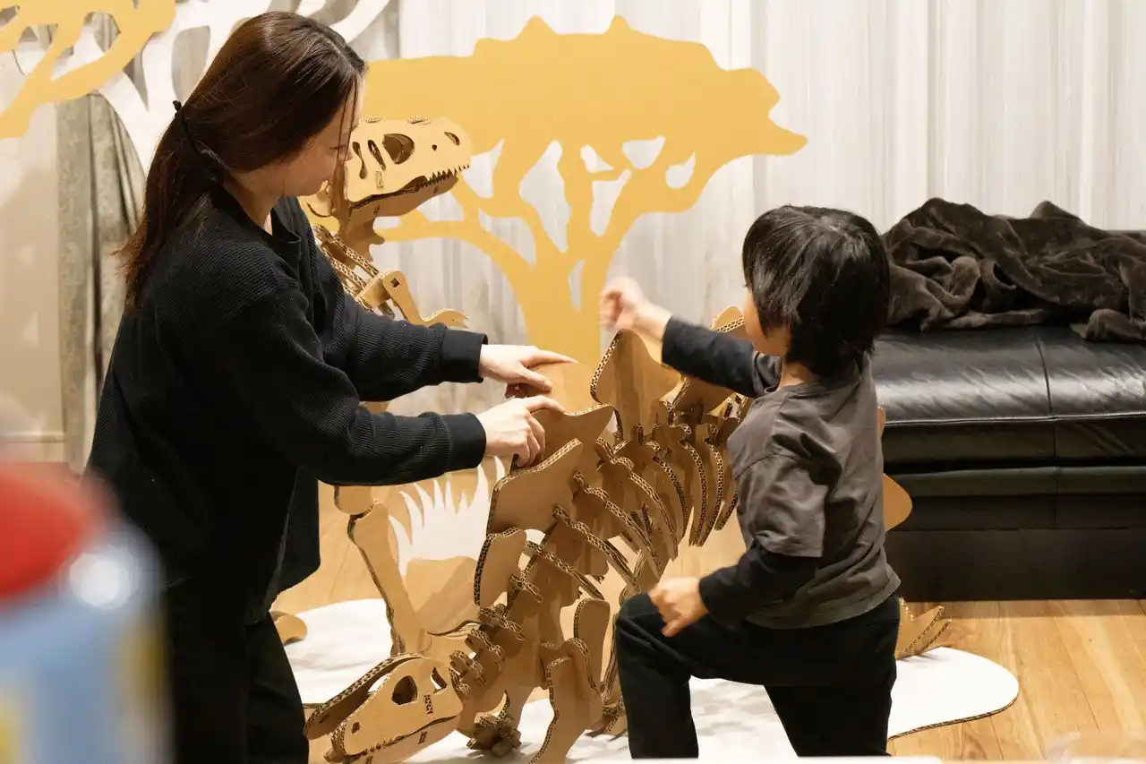 中でも全高180cmのメガティラノサウルスは、複数人での組み立てを前提とした設計となっています。大型ならではのスケール感がもたらす高揚感とともに、参加者同士が力を合わせて完成させる過程において、達成感やその喜びを共有する時間の創出を意図しています。 |