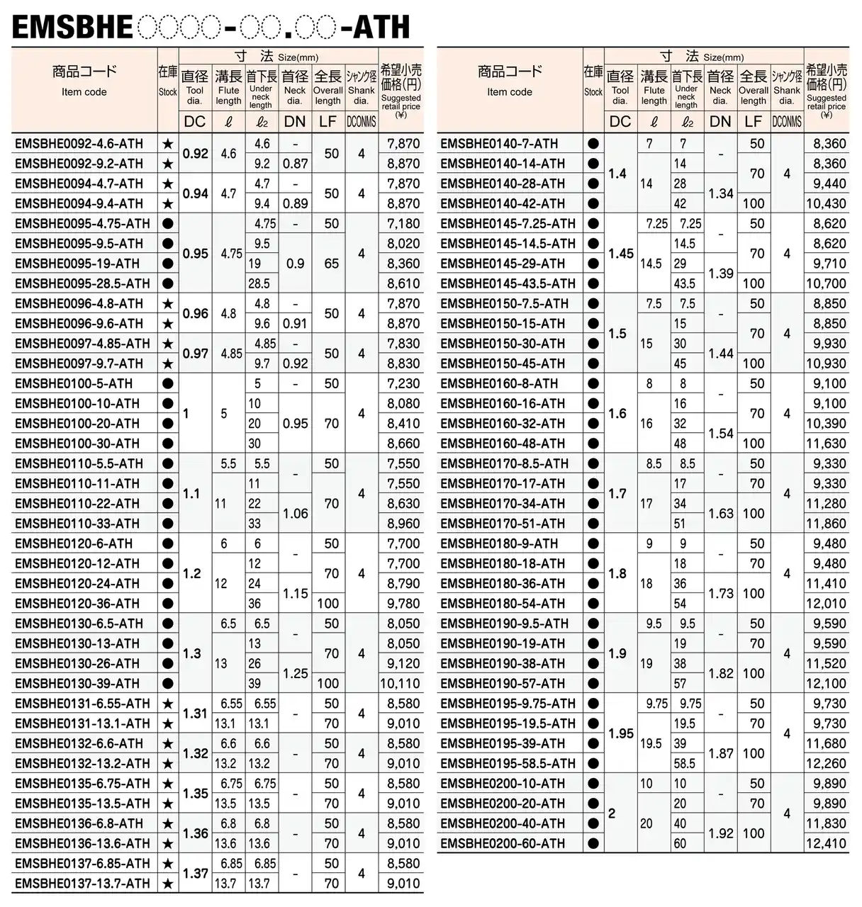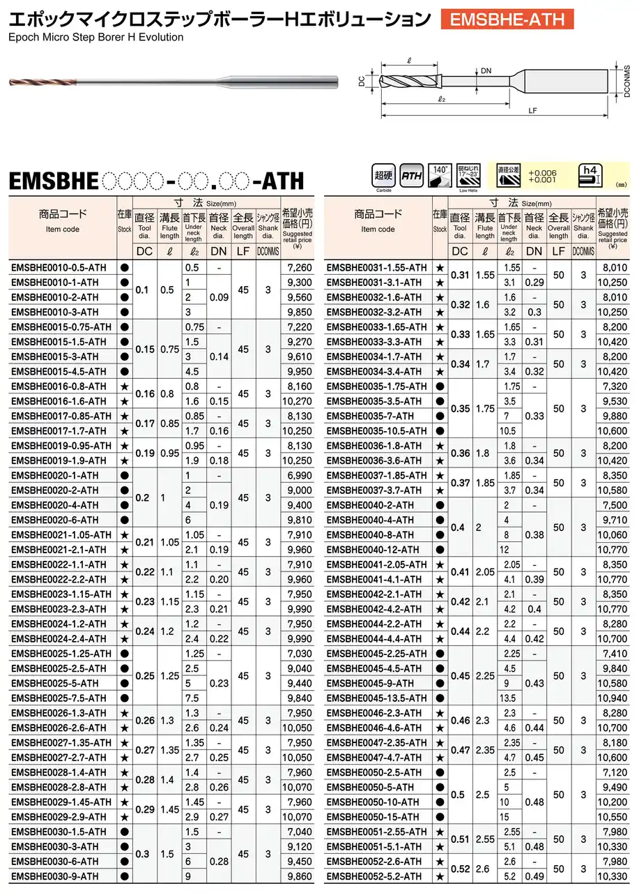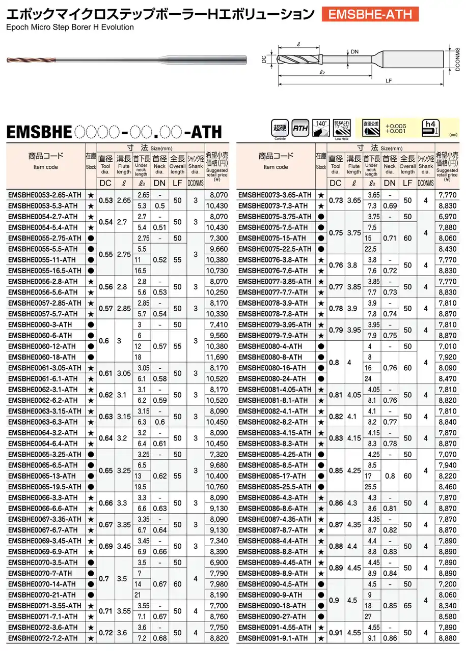 株式会社MOLDINO(本社:東京都墨田区 代表取締役社長:金子 善昭 以下MOLDINO)は、高硬度鋼用微細超深穴加工ドリル エポックマイクロステップボーラーHエボリューション「EMSBHE-ATH」にサイズを追加し、2026年3月23日より発売いたします。 |