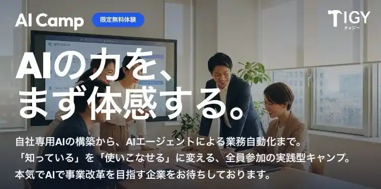 株式会社TIGY(本社:東京都、代表取締役:工藤夕茉)は、生成AIの実務活用を劇的に加速させる実践型AI研修プログラム「AI Camp」の提供を開始いたします。あわせて、個社ごとにカスタマイズされた研修プログラムを初回1回に限り無料で体験できるAI導入加速キャンペーンを実施することをお知らせいたします。