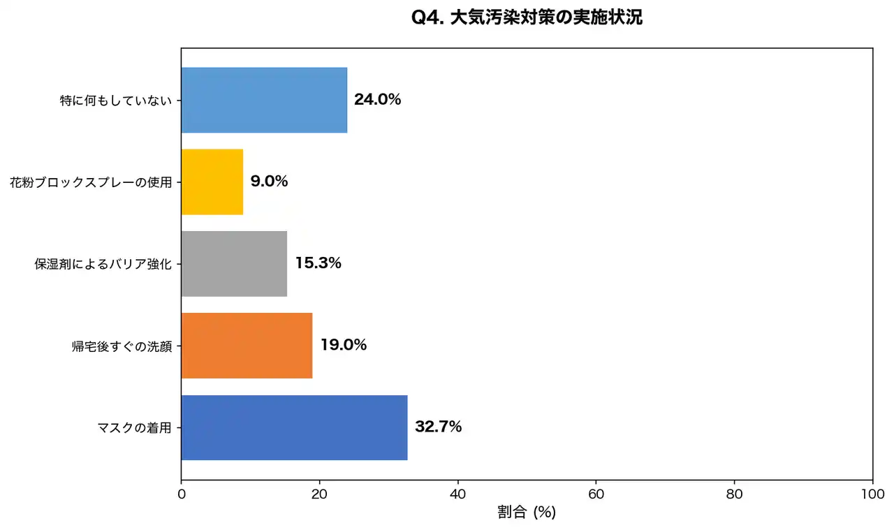| マスク着用が最も多い対策でしたが、肌に直接的に効果のある「帰宅後の洗顔」や「保湿によるバリア強化」を実践している人は少数派でした。また、24.0%の人は何も対策をしておらず、適切なスキンケア方法の啓発が必要です。 | ||||||||||||||||||||||||||||