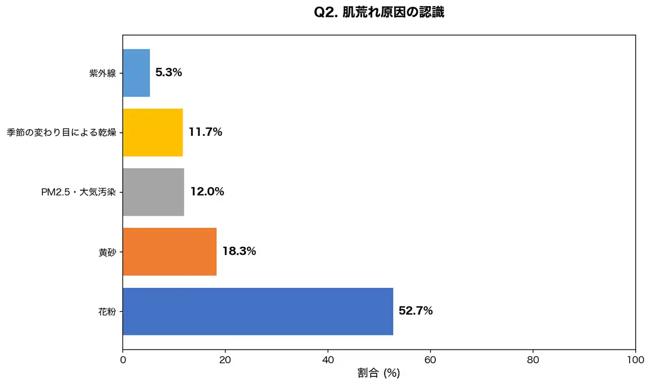 | 花粉を原因と認識している人が過半数を占める一方、黄砂やPM2.5の影響を認識している人は合わせて30.3%にとどまりました。実際には複合的な影響を受けているにもかかわらず、原因を正しく把握できていない可能性があります。 | ||||||||||||||||||||||||||||