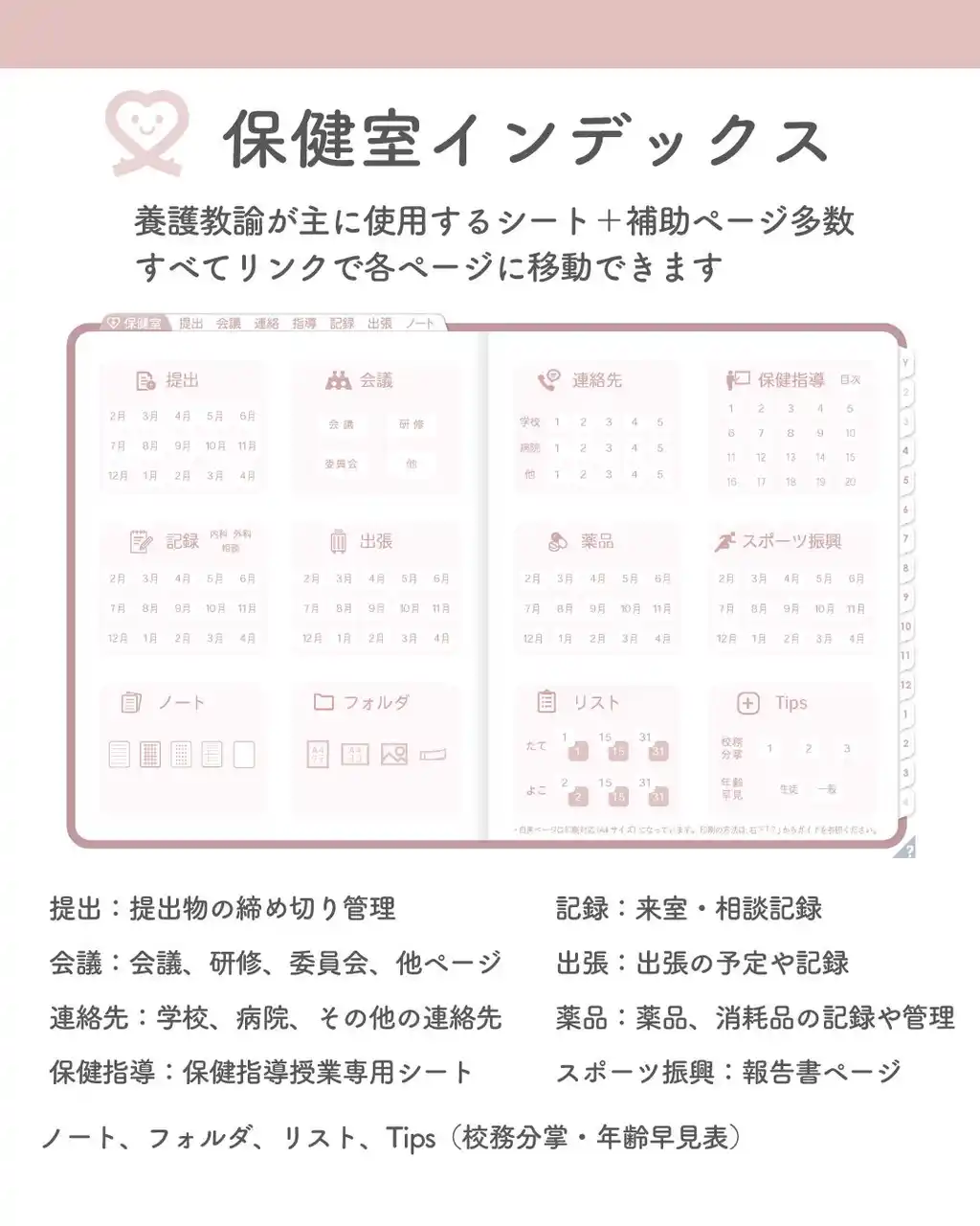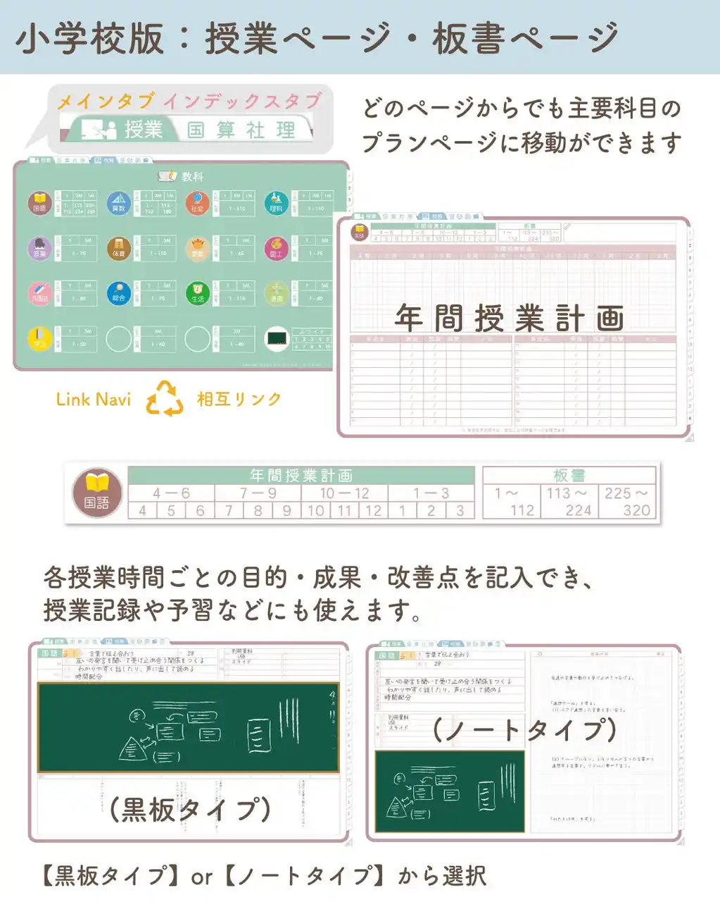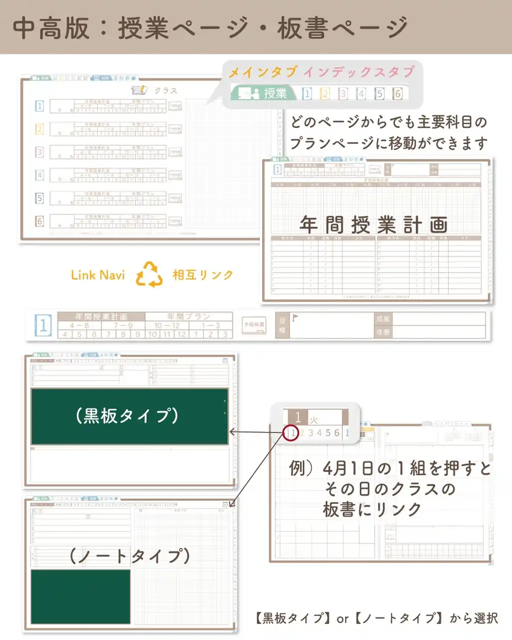 リンク機能などを活用し、必要なページへ素早くアクセスできる構造で、教員の時間管理と業務整理をサポートします。 |