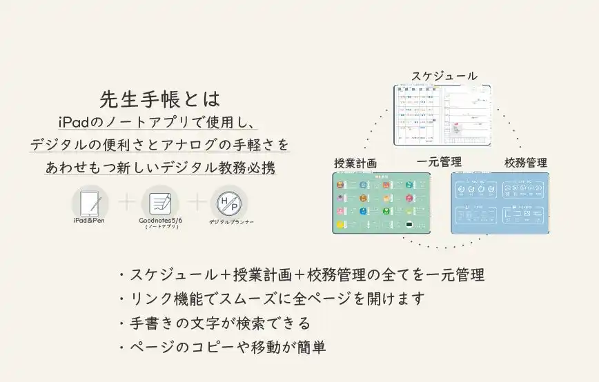 そこでHELLO PLANNERでは「先生のための手帳づくり」をモットーに、教育現場での実務経験に基づく時間管理ノウハウを凝縮した、iPad専用デジタル手帳を開発しました。 |