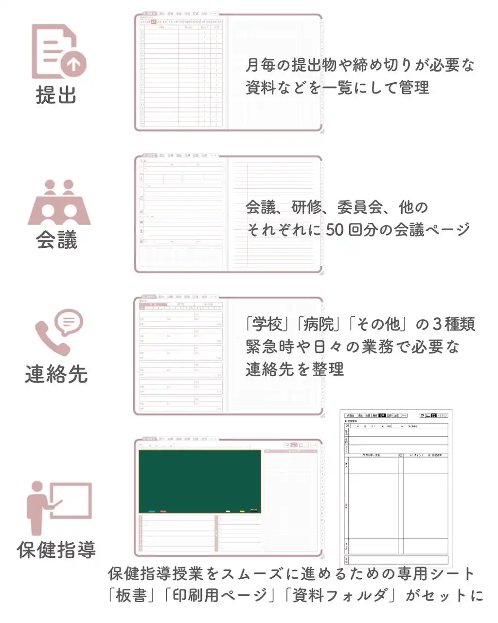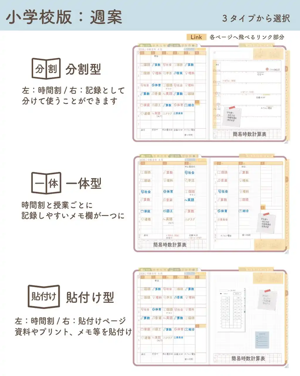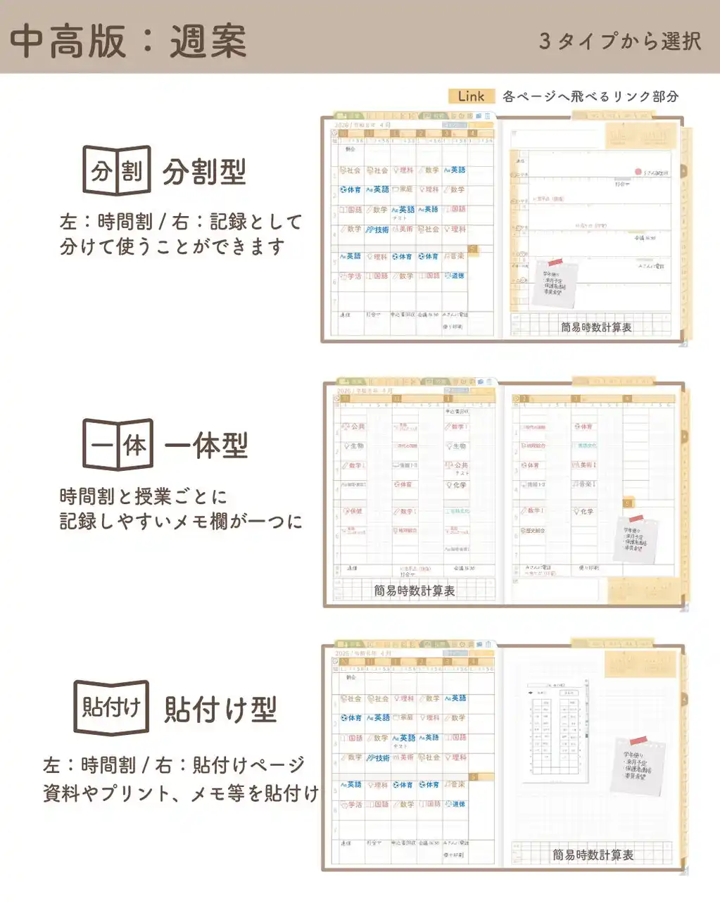 ・週案:1週間見開きタイプ/週案+記録の分割タイプ/週案+貼付けスペースの貼付けタイプ |