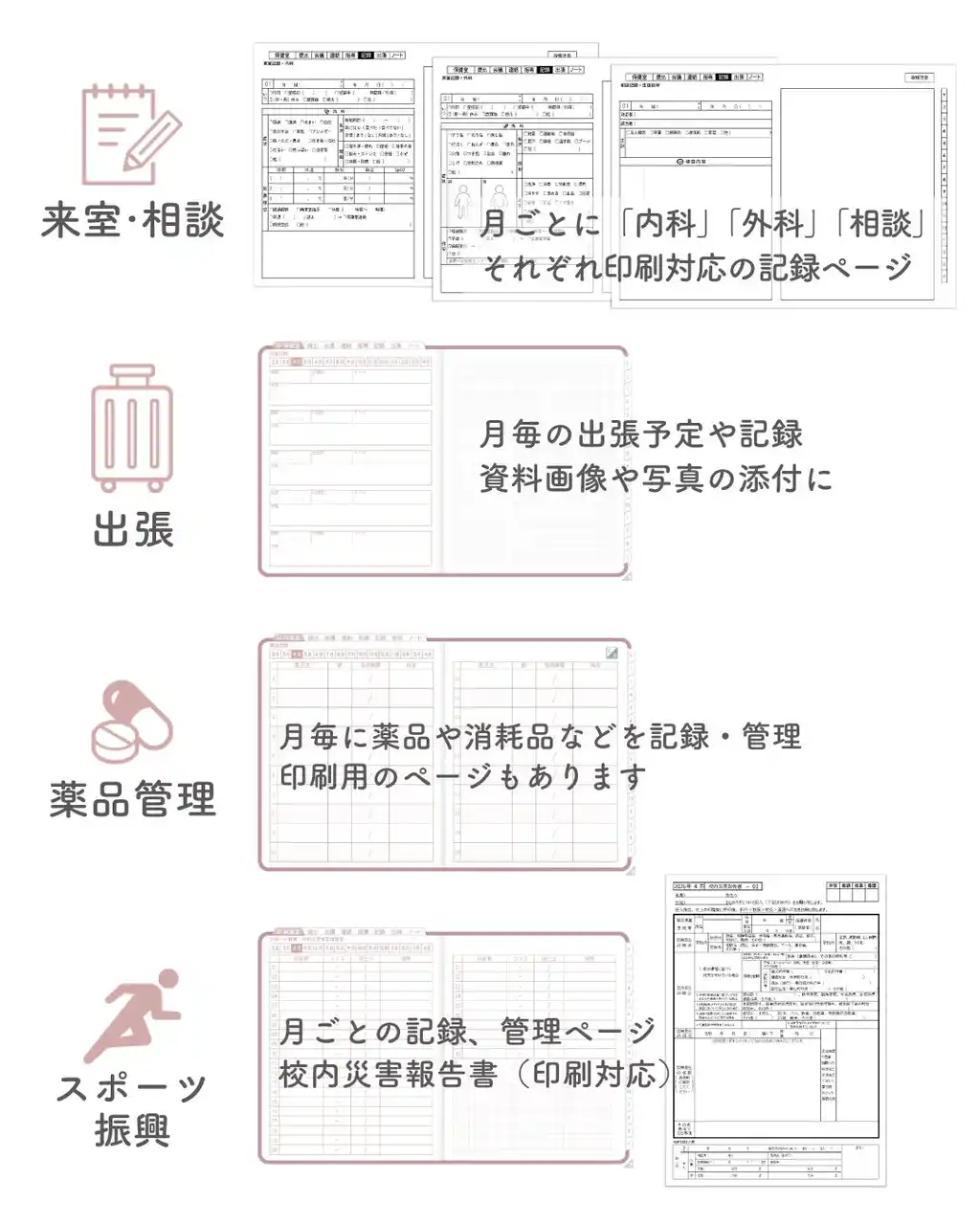 ・保健室(養護教諭)版:保健行事や各種記録など保健室業務の進捗管理に特化。 |