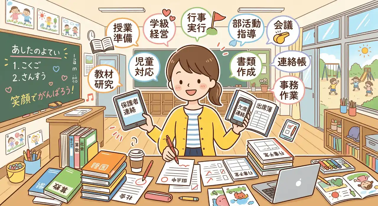 近年、教員の働き方として授業準備や校務分掌、会議、保護者対応といった多岐にわたる業務と長時間労働が社会課題となっています。 |