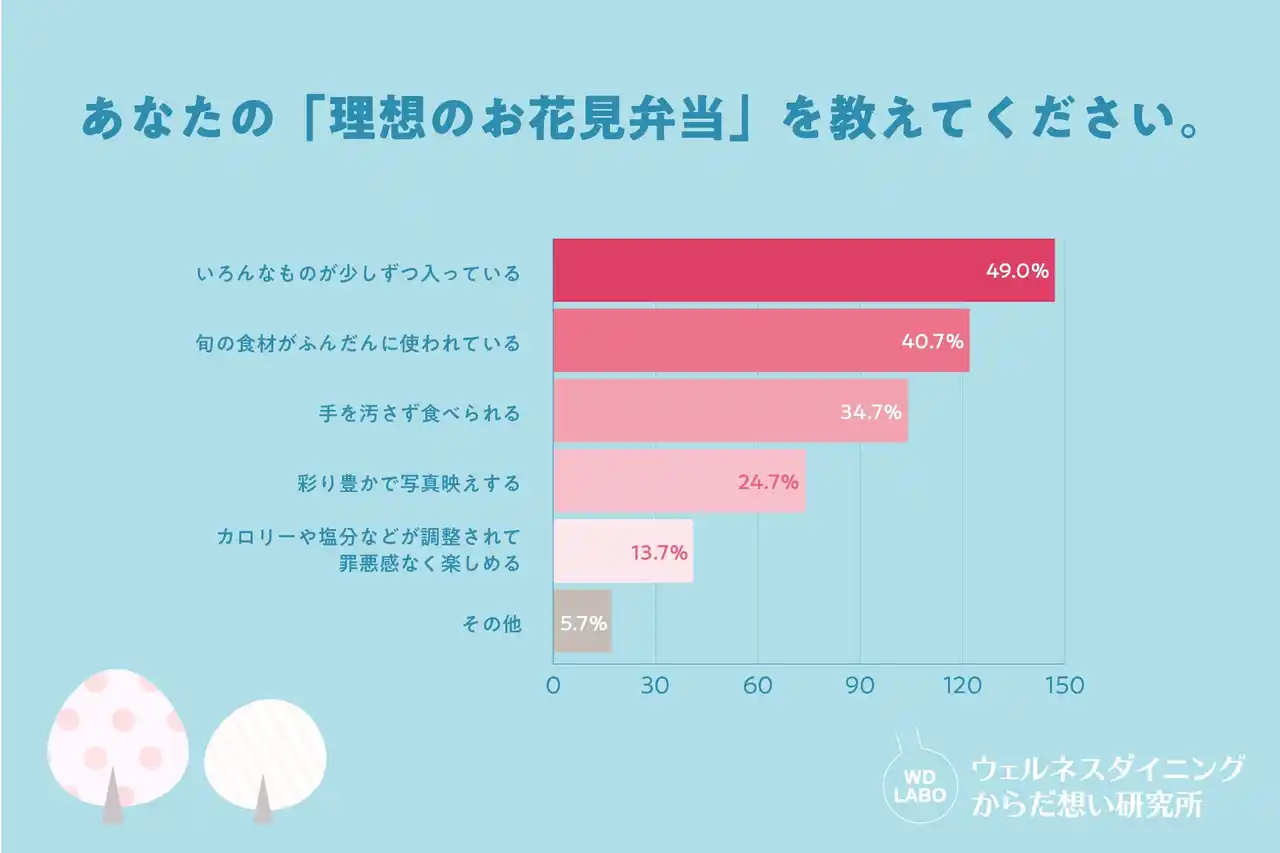 | 一方で、理想のお花見弁当については「旬の食材がふんだんに使われている」(40.7%)、「いろんなものが少しずつ入っている」(49.0%)と回答した人も多く、約4割が"健康やバランス"を意識していることが明らかになりました。 | ||||||||
