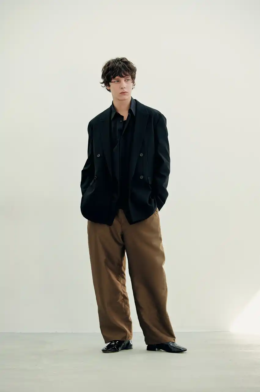 ダブルブレストのジャケットを軸に、洗練されたモダンスタイルを構築。ブラックで統一した上半身に、ブラウンのパンツを合わせることで程よいコントラストを演出し、都会的で落ち着きのある印象に仕上げている。 |