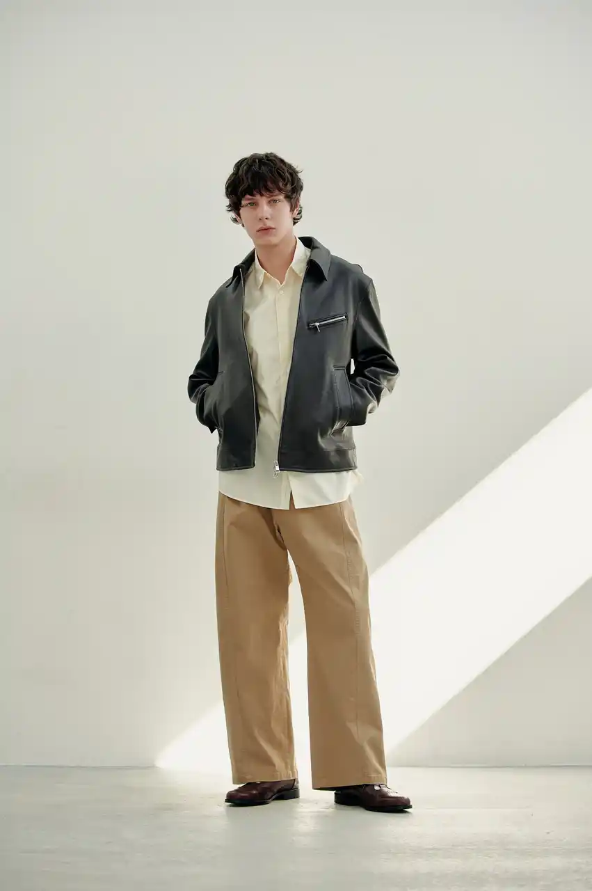 レザージャケットを主役に据えた2つのスタイリング。グレーのセットアップで品よくまとめた着こなしと、ベージュパンツで軽やかに仕上げたスタイルが、無骨さと洗練をバランスよく引き立てる。 |
