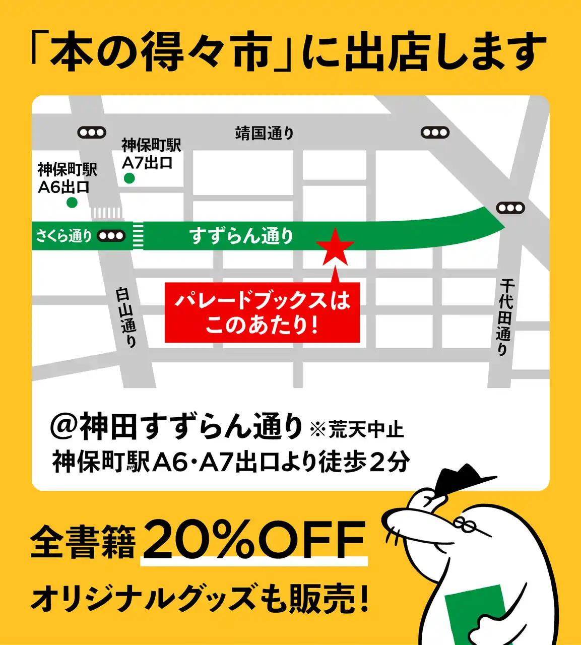 | 毎秋恒例の本の祭典「神保町ブックフェスティバル」。2025年秋にはパレードブックスも初出店を予定していましたが、あいにくの天候により、第33回の歴史で初となる全日程中止に…。その悔しさを受け、今年は春にも開催されることになりました。私たちも初出店に再挑戦です! | |||||||