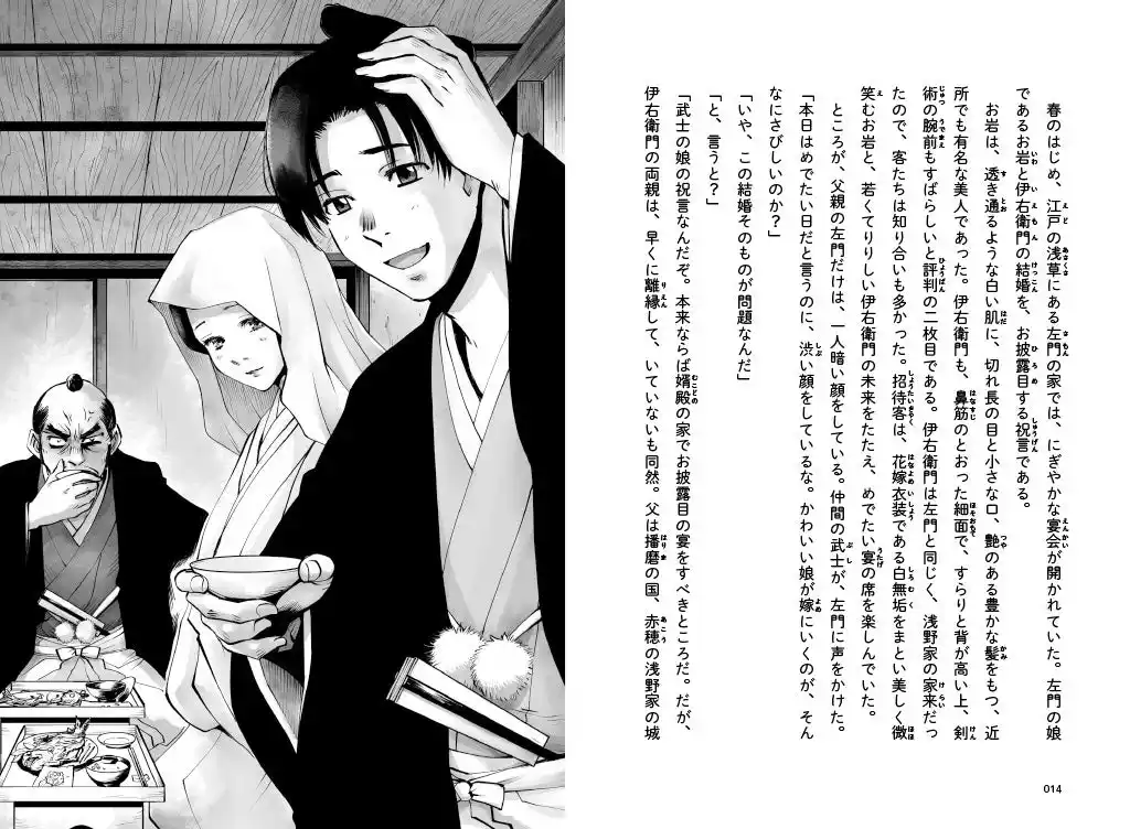 | 二人が祝言をあげて間もなく、江戸城で、赤穂藩の大名・浅野内匠頭が吉良上野介に斬りかかる、いわゆる「赤穂事件」の発端となる刃傷事件が起きる。その結果、浅野家は取りつぶしになり、伊右衛門も左門も浪人になってしまった。 | ||||||||||||||||