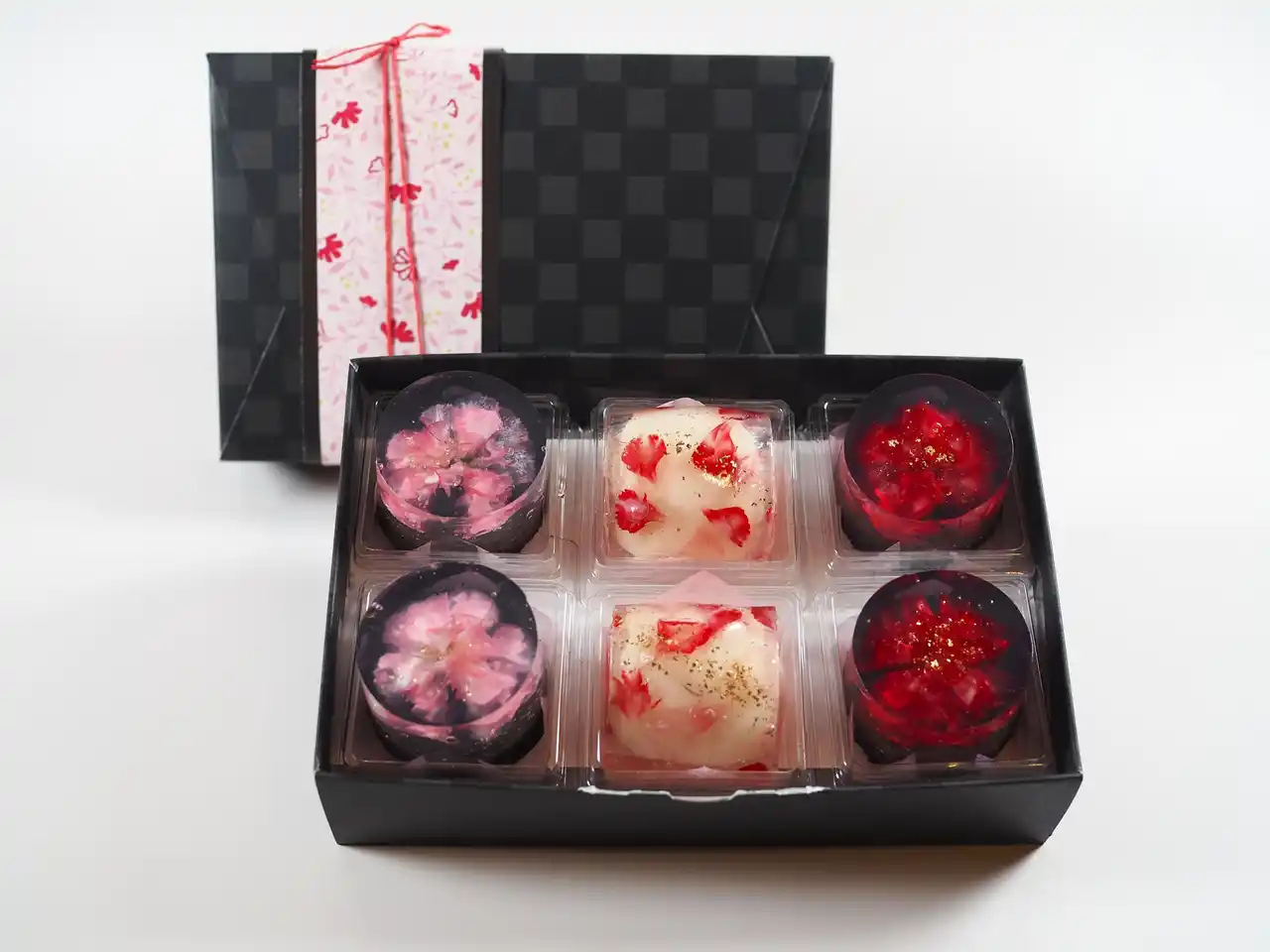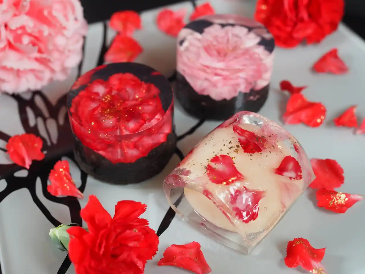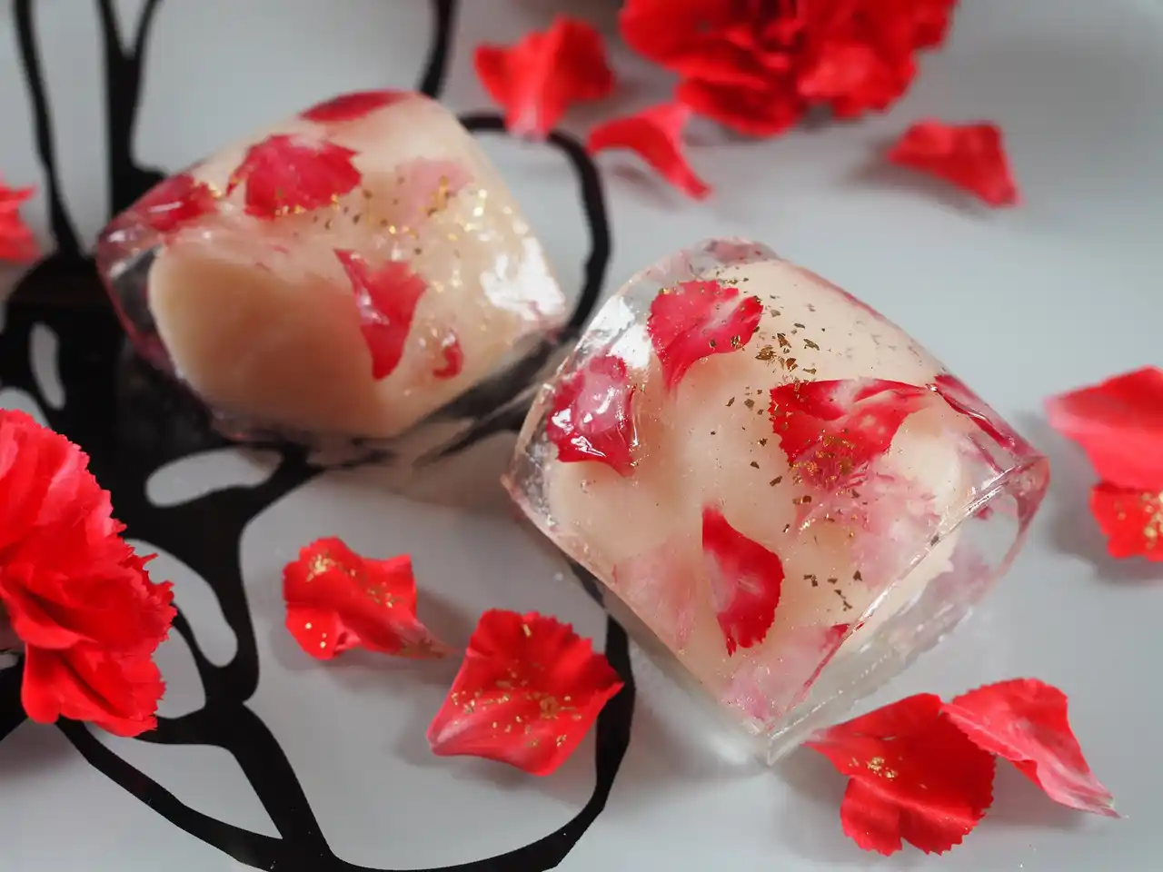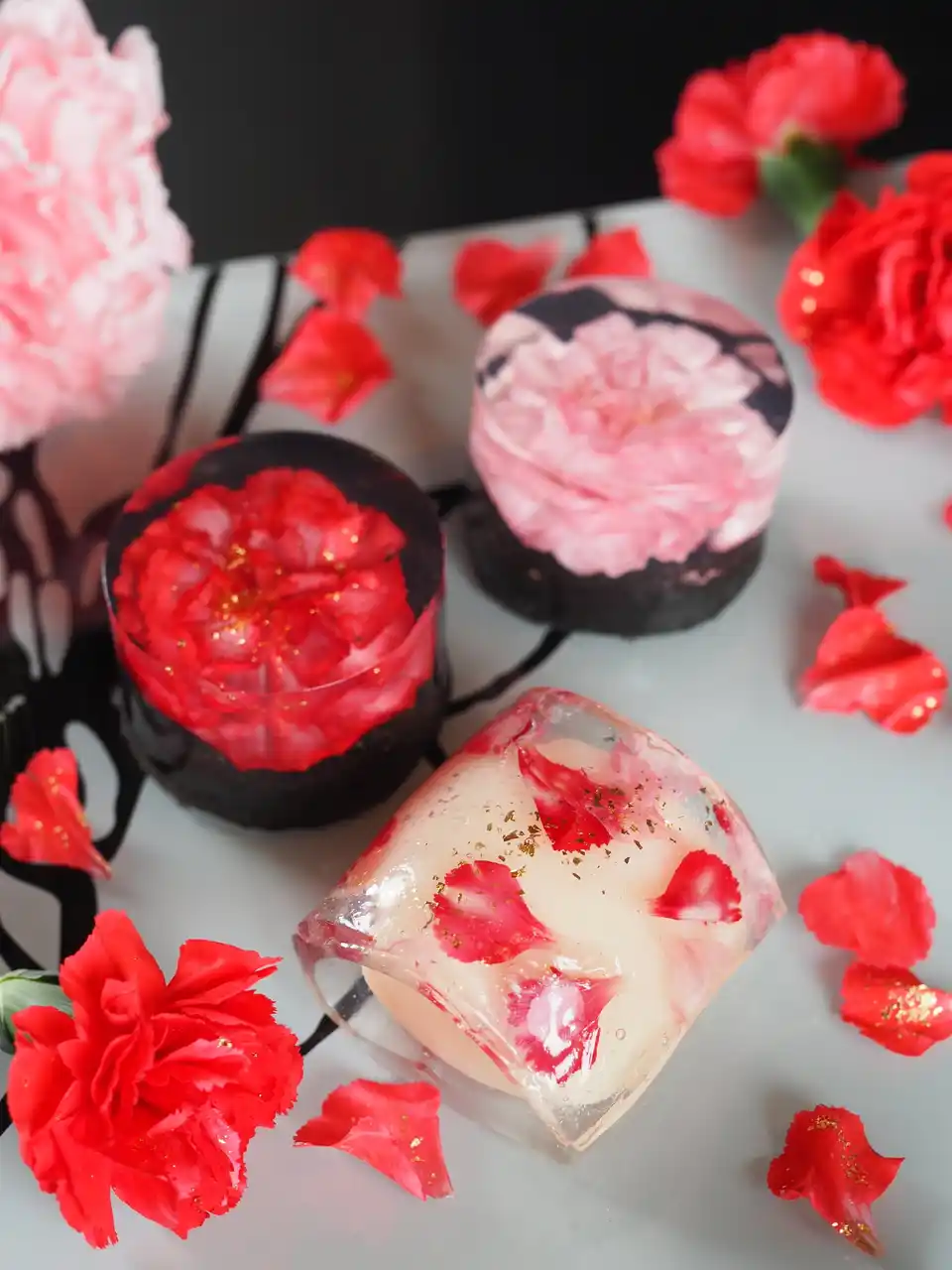 | 透明な錦玉羹に、豊橋産カーネーションを一輪ずつ咲かせるように閉じ込めました。 | |||||||||