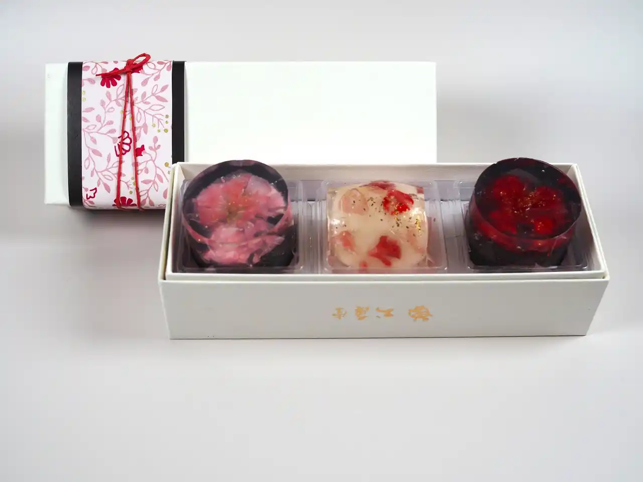 | 花びらを散らした錦玉羹で、自家製ホワイトチョコレートを練り込んだ白餡を巻き上げました。 | |||||||||