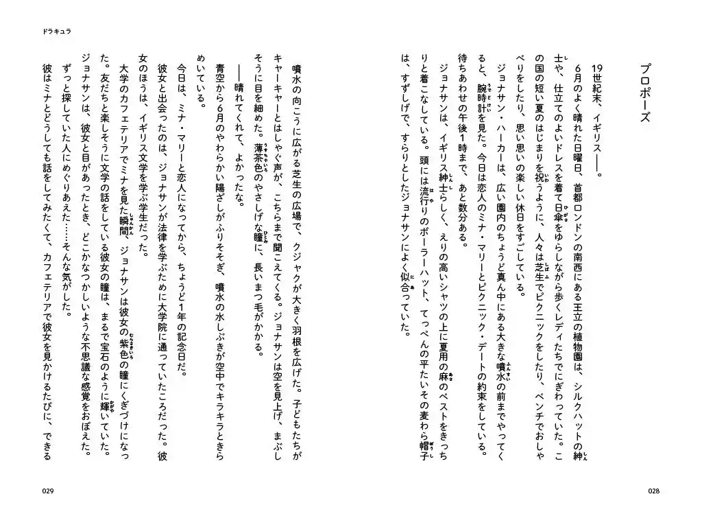 | そのころミナは、ジョナサンからの手紙が届かなくなったことに不安を覚え、友人のルーシーとその恋人のアーサーに相談をし、東ヨーロッパの歴史や伝説に詳しいヴァン・ヘルシング博士と会うことに。博士の話を聞いた3人は、ドラキュラ伯爵のおそろしき正体を知る。ジョナサン、そしてミナたちは伯爵の魔の手から逃れることができるのか――。 | ||||||||||||||||
