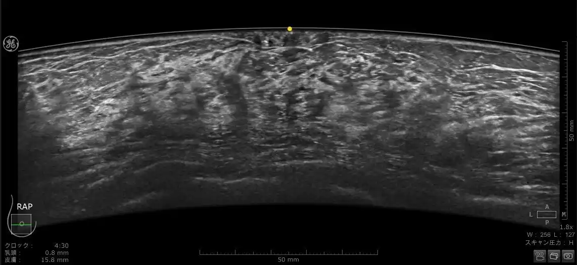 Invenia ABUS Premium で収集された乳房画像(乳頭直下「図黄色点」が描出されている) |