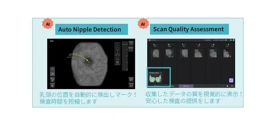 AI技術を取り入れた新しい機能*は、検査時に乳頭の位置を自動的に検出し、取得したボリュームデータの撮影範囲やスキャンの品質などを視覚的に表示します**。また、撮り忘れ防止のサポートや自動化による医療従事者への作業負担の軽減でスムーズな検査環境に寄与します。その他、ハードウエアの刷新でスキャン速度が従来より約40%***短縮し、検査時間の削減にも貢献します。 |