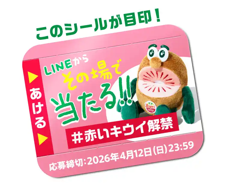 「ゼスプリ ルビーレッドキウイ」は今年も、キャンペーンシール付きパックを数量限定で販売いたします。パッケージに貼られたキャンペーンシールで応募すると、大当たり賞 キウイブラザーズ【レッド】小サイズぬいぐるみ1体が2,000名様に当たります。落選しても、Xでシェアすることでダブルチャンス賞への応募が可能に。キウイブラザーズ【グリーン】または【ゴールド】の小サイズぬいぐるみ1体がそれぞれ500名様 計1,000名様に当たります。 |