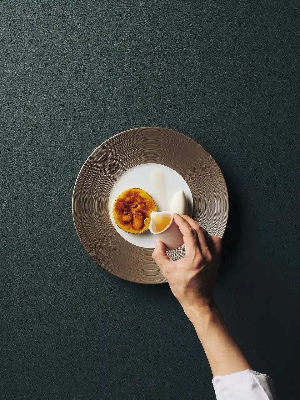 キャラメリゼしたフォアグラのブリュレの表面を割ると、シャキシャキとしたホワイトアスパラガスが現れます。香ばしく甘い香りが立ち込める皿には、Mosel産の白ワインにレモンを加えた酸味のあるジェリーを添えました。素材の香りが鼻を抜けるホワイトアスパラガスのソルベと、パリパリのカラメルの食感を存分にお楽しみください。 |