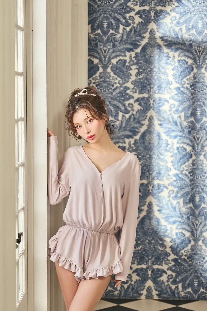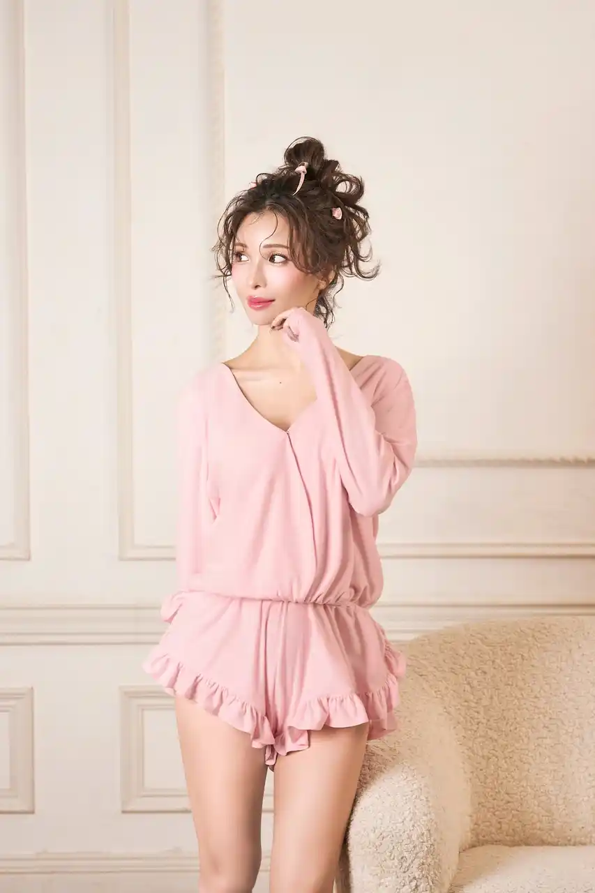 たっぷりフリルのドレープ感が美しいロンパース。スエード調の生地は毛並みによって表情を変えるので、これ1枚でラグジュアリーなコーディネートが完成します。きゅっと絞られたウエストと、裾口のたっぷりフリルでメリハリをつけたシルエットは、スタイルアップ効果も期待できます。フロントはカシュクールデザインでゆったりと着ることができ、お家でのリラックスタイムに最適です。スエード調の起毛素材なので、非常に肌触りが良く、思わず抱きしめたくなるルームウエアです。