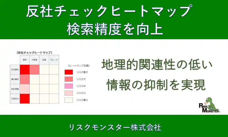 法人会員向けに与信管理クラウドサービスを提供するリスクモンスター株式会社(本社:東京都中央区、代表取締役社長:藤本太一)は、2026年3月15日に「反社チェックヒートマップ」における検索結果のノイズ除去精度を向上する機能改修を実施しましたので、お知らせいたします。