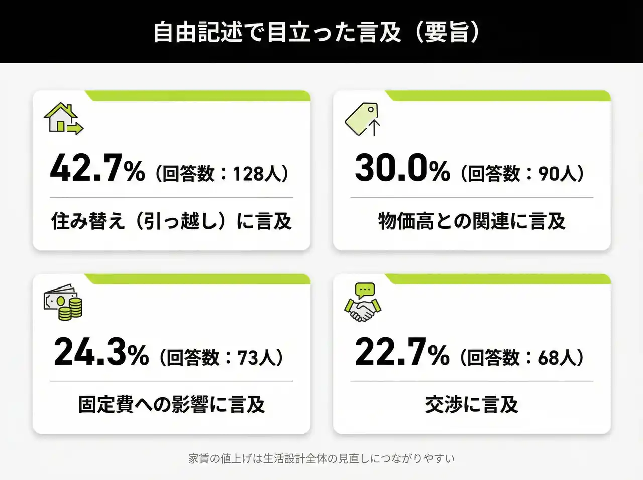 | 住み替え(引っ越し)に言及:42.7%(128人) 固定費への影響に言及:24.3%(73人) 交渉に言及:22.7%(68人) 物価高との関連に言及:30.0%(90人) 自由記述に見られた主な声(要旨) | |||