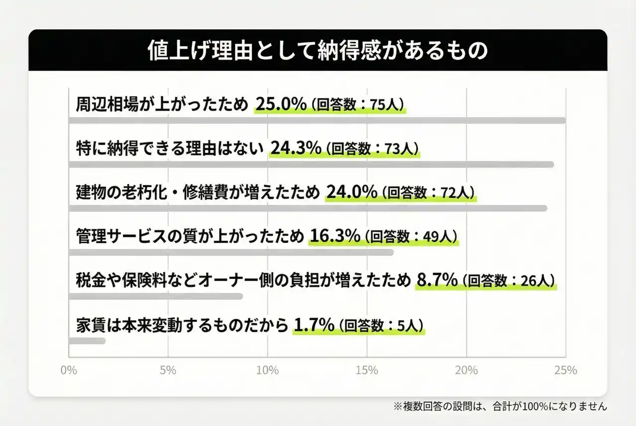 | また、値上げ理由の納得感では周辺相場が上がったため25.0%(75人)、建物の老朽化・修繕費が増えたため24.0%(72人)など外部環境・維持コストが上位に入る一方で、特に納得できる理由はない24.3%(73人)も同水準となり、値上げの伝え方・説明の不足が不満につながる可能性が示唆されます。 | |||