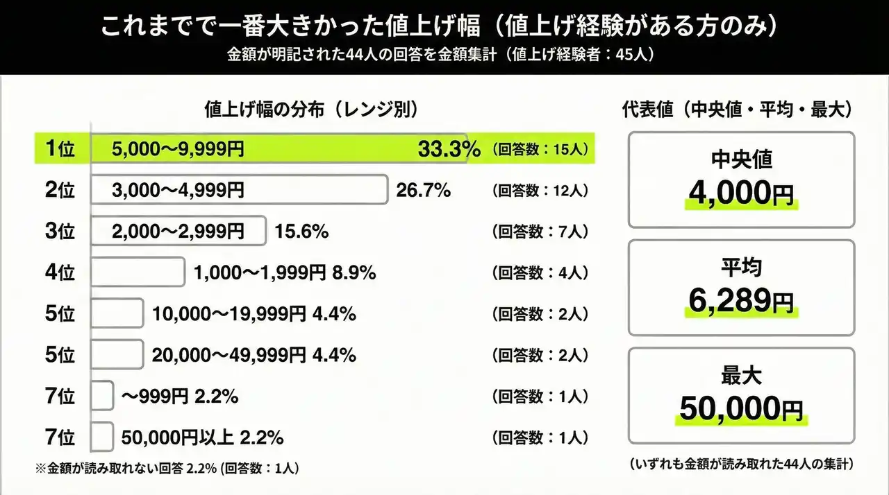 | 平均6,289円が中央値4,000円を上回る点は、一部の高額な値上げ事例が平均を押し上げている実態を示しています。この差異は、値上げ幅の分布に偏りがあることを意味します。 | |||