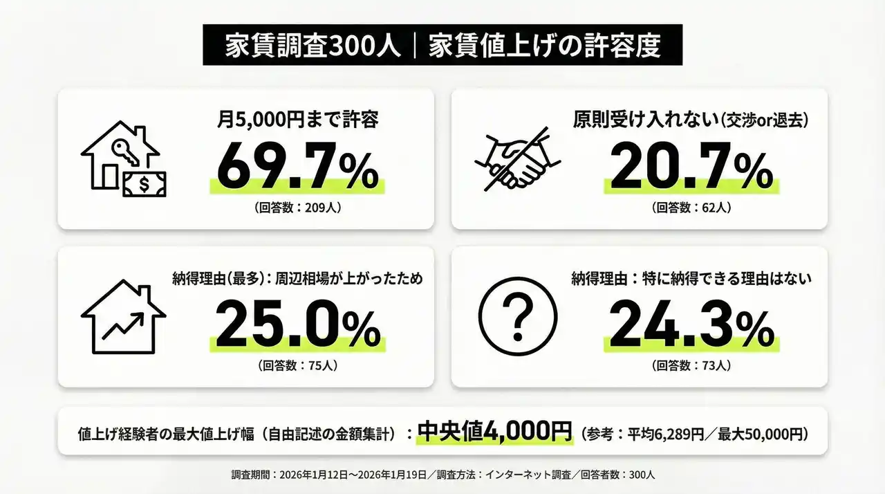 | 家賃調査300人:値上げ許容は月5,000円まで69.7%(209人)――一方、2割が原則受け入れない(交渉or退去)20.7%(62人)。納得理由は周辺相場25.0%(75人)も、特に納得できる理由はない24.3%(73人)が拮抗 | |||