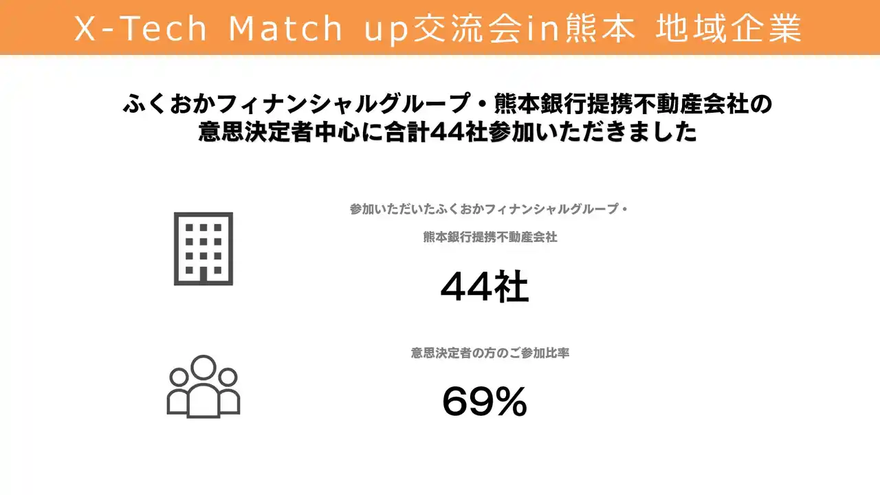 株式会社ふくおかフィナンシャルグループ(取締役社長 五島 久、以下「ふくおかフィナンシャルグループ」) 傘下の株式会社FFGベンチャービジネスパートナーズ(代表取締役社長 吉田 泰彦、以下「FVP」)は、株式会社熊本銀行主催『FFG・熊本銀行提携不動産会社交流会』と共同開催にて、スタートアップと地域企業のネットワーキングイベント『 X-Tech Match up(クロステックマッチアップ) 交流会 in熊本』実施いたしました。