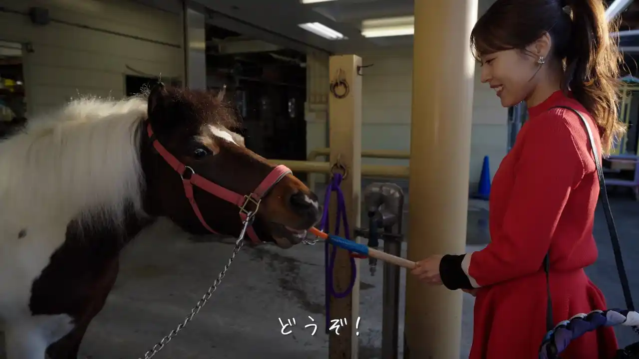 まだ冬の寒さが残る2月初旬、鮮やかな赤の衣装を着こなした有村さんと撮影が始まりました。「なぎさポニーランド」では、穏やかな性格のポニー「すももちゃん」と対面。有村さんはポニーを間近で見るのは初めてでしたが、棒につけたにんじんを差し出すと「わああ、にんじん大好きなんだね~」と優しく声をかけ、すぐに打ち解けた様子。おでこを撫でながら「かわいい~!」と褒めるなど、動物との触れ合いに終始リラックスした笑顔を見せてくれました。 |