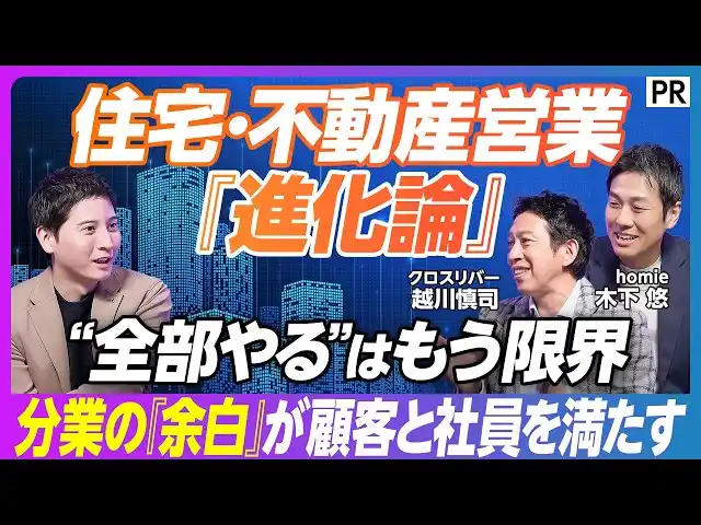 住宅・不動産営業のDXおよび分業化支援を行うhomie株式会社(本社:東京都渋谷区、代表取締役:村上靖知)は、ビジネス映像メディア「PIVOT」の人気番組『& questions』に出演いたしました。 本番組では、弊社専門役員の木下悠と、働き方改革の第一人者である株式会社クロスリバー代表・越川慎司氏が登壇。 MCに西川典孝氏を迎え、 情報過多時代において顧客に選ばれ続けるための「次世代の営業スタイル」と、それを支える「働きがい」の本質について、実演デモを交えて詳しく解説します。 |