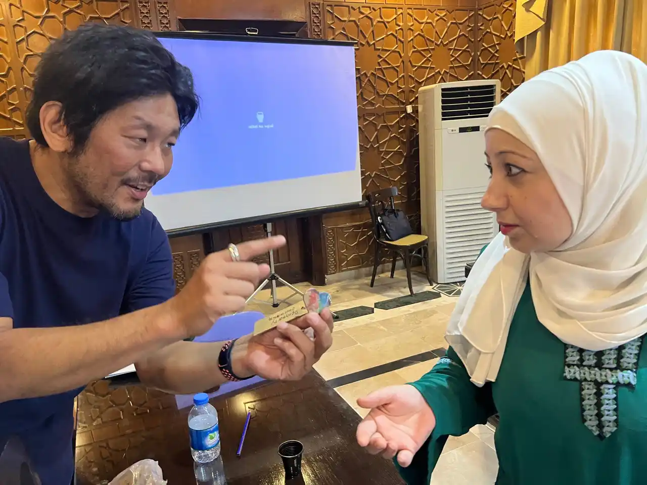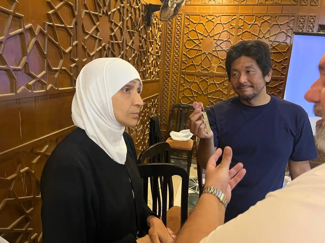 シリア・デリゾールの教育行政官たちに届いた早稲田佐賀のキーホルダー |